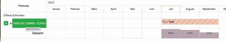 Besonders hilfreich: Die App Odoo Planung erlaubt sowohl eine Grobplanung auf Jahresbasis als auch detaillierte Monatsansichten – inklusive automatischer Berechnung der Stunden auf Basis von Arbeitstagen und Abwesenheiten.