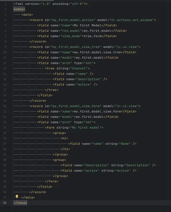 Erstellen Sie die Datei my_first_model_views.xml im Ordner views und fügen Sie folgende Inhalte hinzu: