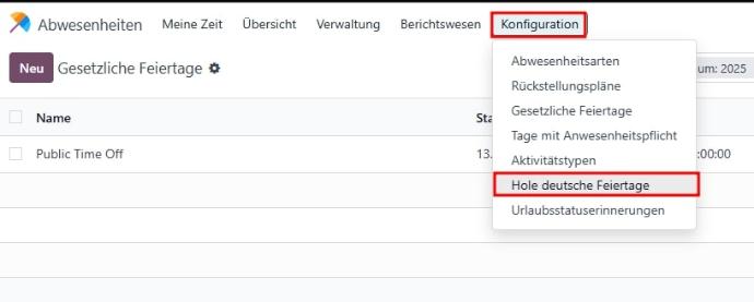 Die Standardfunktionen der Odoo App Abwesenheit bleiben bestehen und werden durch das Modul gezielt erweitert. Damit lassen sich gewünschte Feiertage abhängig vom Bundesland bequem ins System übernehmen. Voraussetzung ist die Existenz eines Nutzers mit Administratorrechten in der Odoo App Abwesenheit.